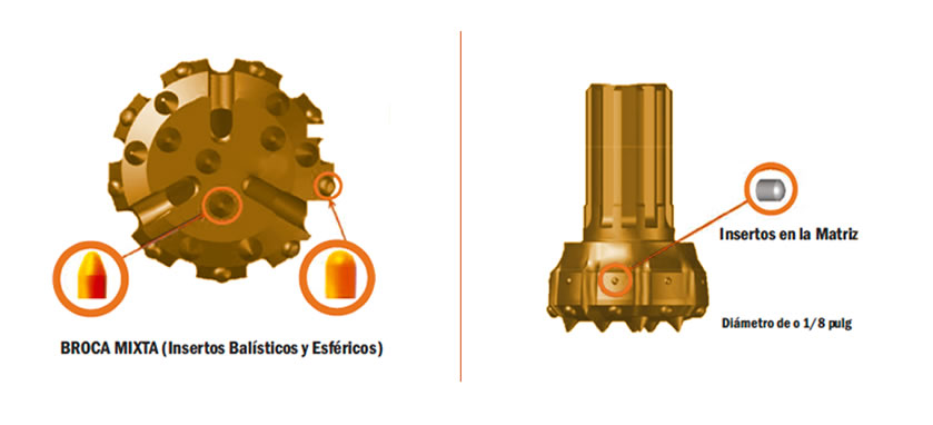 DTH BITS están equipados con botones de carburo en diversas configuraciones, formas y diseños garantizando tasas de penetración máximas, buen lavado y larga vida útil. Para terrenos muy abrasivos nuestros diseños de brocas mixtas cuentan con insertos balísticos en el centro generando mayor ataque; del mismo modo, cuenta con insertos esféricos en el contorno para reforzar la broca.